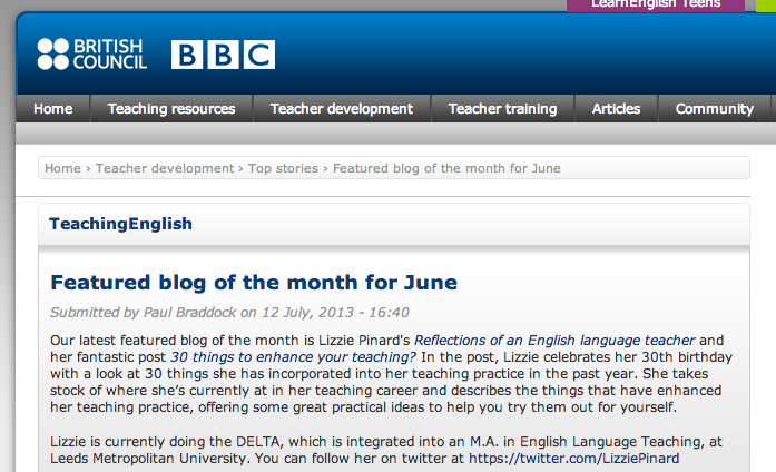 Here is a link to the guest post I was asked to do for the British Council blog (the title of which was coined by the editor – as far as I was concerned, I was writing about reflective practice! Had the brief included that title, I would probably have run a mile… :-p ) following notification of my victory. Thank you to the British Council for giving me that opportunity to write a post for them, and indeed for the award itself – both of which are a great honour.