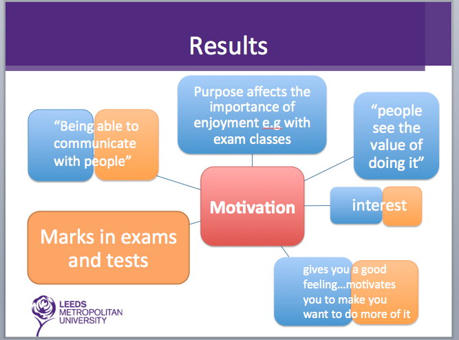 These are the ideas relating to enjoyment that I thought were linked with motivation. Some relate to intrinsic motivation, some to extrinsic motivation (or the ideal self/ought self) and some relate to the L1 learning process leading to motivation. So, motivation is certainly important, according to both my respondents and the literature.