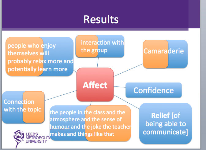 Enjoyment was also linked to positive affect. Thus, relief, relaxation, interaction, camaraderie, confidence and connection with topic all contribute to the lowering of the affective filter, and if these are present then it is safe to say that enjoyment would not be far behind.