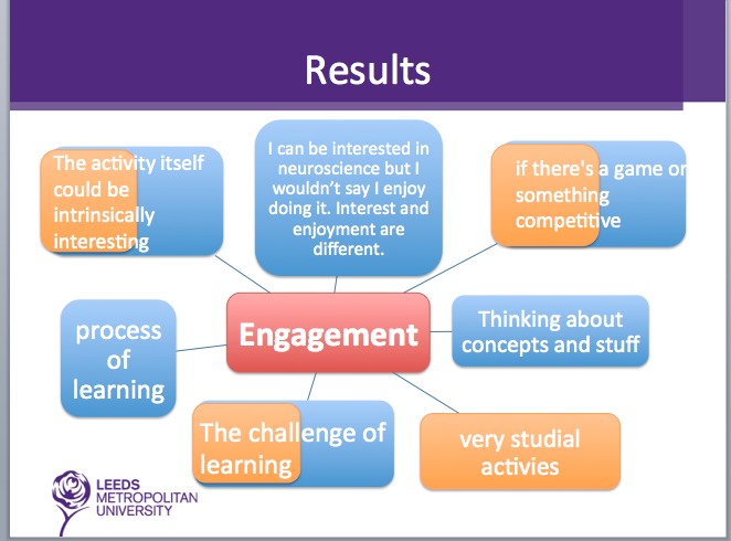 Enjoyment was also linked strongly with engagement. My respondents seemed to agree that enjoyment emerges as a result of engagement. Thus, interest, challenge, the learning process, studial activities, concepts and games/competitions were all associated with both engagement and enjoyment – possibly because if a learner wants to be engaged in these ways, then when the need is met, their enjoyment will likely emerge.