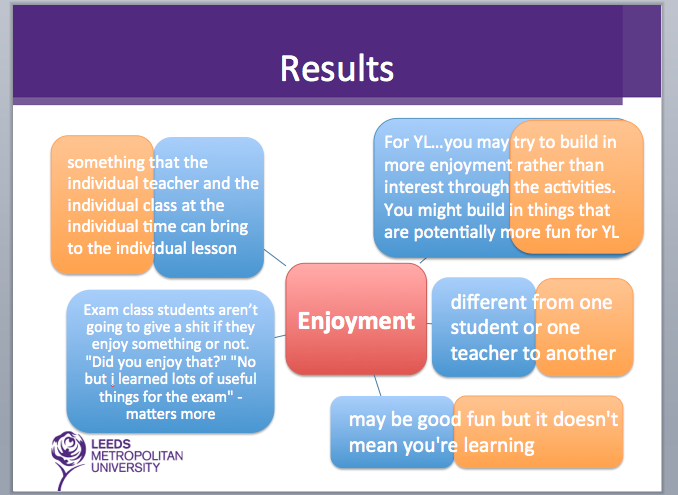 There are obvious limitations to this exploration – I did not search all the articles that have ever been written and my database search was only of one journal. However, I felt that if enjoyment was important for materials development, then it would have been mentioned in Tomlinson’s 2012 literature review. I also did not search for synonyms of enjoyment, but this was deliberate: synonyms are tricky and can mean subtly different things. For example, engagement. I found in my study that people often associate enjoyment and engagement, using the two interchangeably in some cases, and of course engagement is prominent in the literature, but they are different.