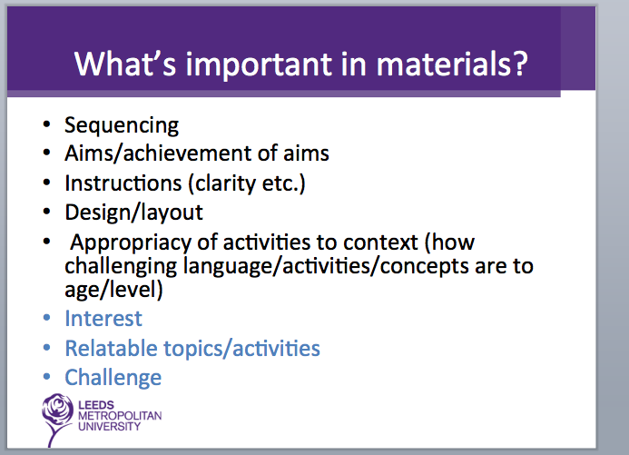 I decided to focus on the materials development perspective, thinking that it would be interesting to see what lesser-heard materials developers’ voices had to say, since the views of the great and good in ELT are already widely known, and contrast this with what I could find in the literature.