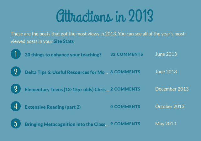 WordPress and I agree with regards to number 1. 30 things to enhance your teaching? would definitely have headed my list of my favourite posts of mine from 2013. Why? Because it got me loads of views? No. Because not only did it win me the British Council blog of the month award for June 2013 (which, to be fair, accounts for it topping the “number of views analysis”), but, as importantly, it is also a reminder of the fantastic flavour of learning that I tasted while doing my course at Leeds Met Uni during the academic year 2012/13. I had the time of my life, learnt loads and look back on the experience with great fondness and appreciation.