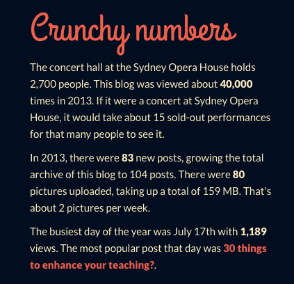 That my posts have been read by people from 164 countries makes me feel a sense of connectedness to teachers and the industry worldwide – I feel a part of something. The teachers I communicate with via Twitter, via this blog, via their blogs (I’m planning a post where I list the blogposts by others which have most inspired me in 2013 – stay tuned! Update: That post is now written and can be found here) and other means of online CPD (e.g. participating in webinars) are all part of the big online staffroom that I am lucky enough to be able to pop into on a regular basis and from which I gain and share ideas, creativity, motivation and inspiration.