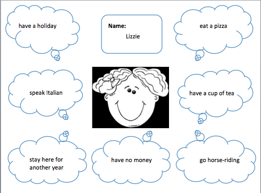 - Get them to ask you questions in order to guess which stem/pattern each answer/thought cloud corresponds with. (The answers are bare infinitives so there are no linguistic clues and learners have to put the answers into the correct form according to the verb pattern).