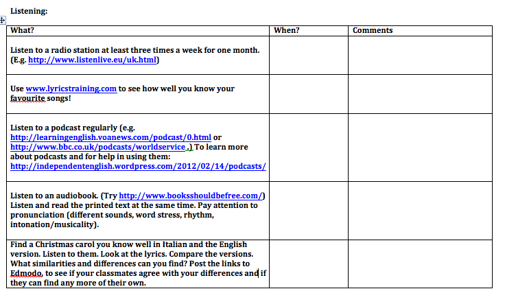 As you can see, the handout consists of a series of activities for learners to try, with space for them to record when they tried it and what they thought of it. The handout is divided up by skill (reading, listening, speaking, writing). What you can’t see here is that in each subdivision, as well as the activities I’ve added, there is space for the learners to add their own ideas. I have two versions of the handout, which you can access below, one of which is aimed at the learners I use Edmodo with and one of which is aimed at the learners I use a WordPress blog with. Both handouts are geared towards a non-English speaking environment, and towards adult learners of General English, reflecting my current context (a private language school in Palermo).