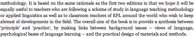 This book, as you can see, is also available as e-book, though you don’t save so much on the paperback price – at least you wouldn’t have issues of storage, I suppose! It is broken down into three sections, each section having several sub-sections: Part 1 – Topics in the design of materials and methods; Part 2 – Teaching Language Skills; Part 3 – Aspects of Classroom Methods. For a complete break-down of all the different sections and a sneak preview of the content, why not visit Amazon and have a “look inside”! This is what the book sets out to do:
