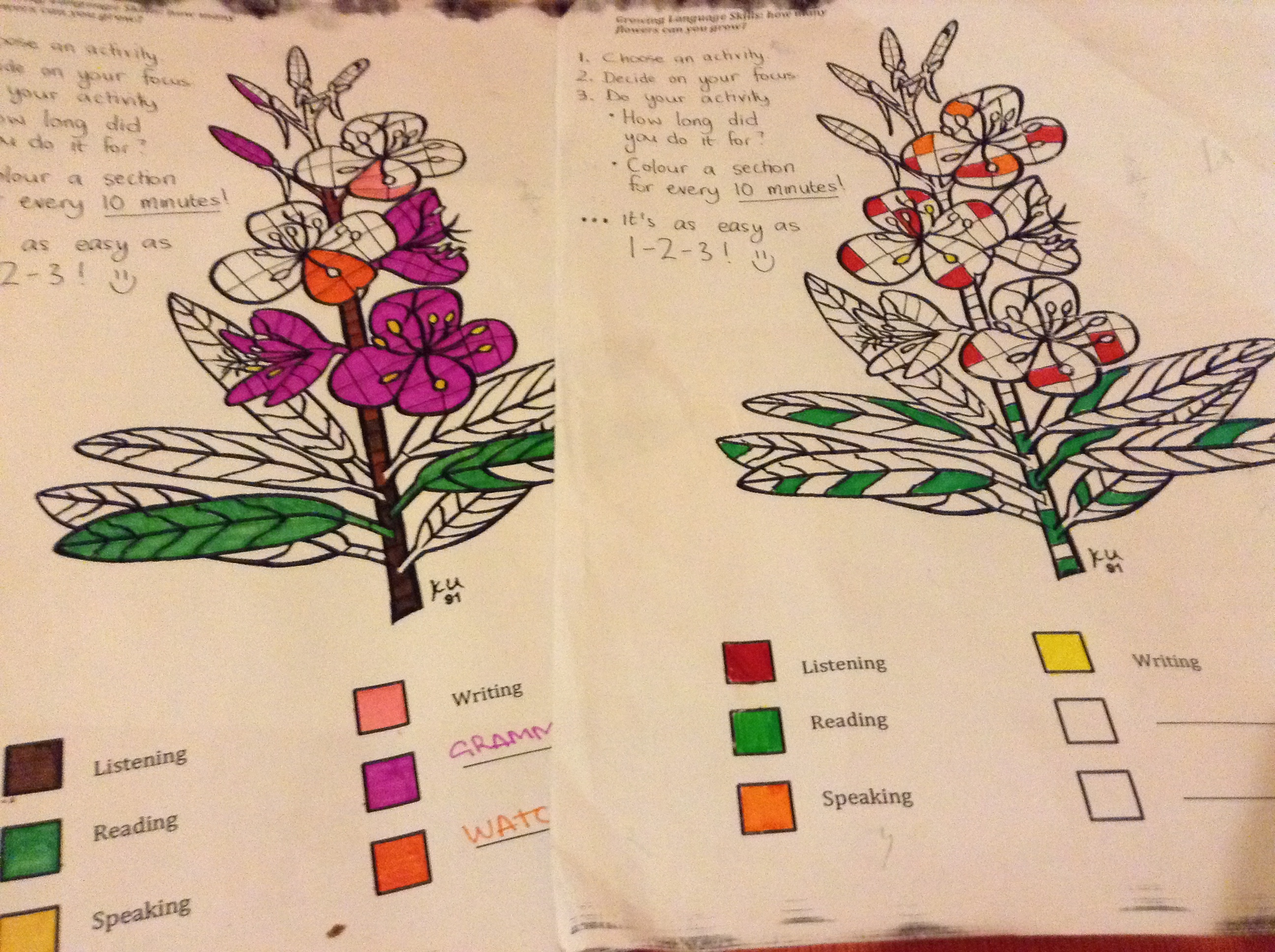 What you don’t see in this image (because I did it manually post-printing and pre-photocopying!) is that I have divided up the entire image into small segments. Each segment represents 10 minutes. The idea is that learners use colour-coding. E.g. listening is blue, reading is red, writing is green, speaking is orange. (There is also space for them to add other things e.g. exam preparation) In this colour-coding example, if they read for 30 minutes, they can shade three segments in red. Of course many activities use multiple skills. In this case, learners need to decide what their goal is in doing that activity – which skill they are focusing on. I also added some instructions to act as a reminder. (See the completed versions below…)