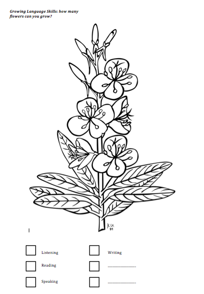 - Motivation: Hopefully, they can feel some kind of satisfaction as the number of shaded segments grows. And if they shade in all the squares, they can have another handout and can start on their second flower. During a course, they can see how many language flowers they can grow. (This I haven’t been able to pilot yet, as I only had the idea late on in the course, so it’s only been a mini-pilot so far…)