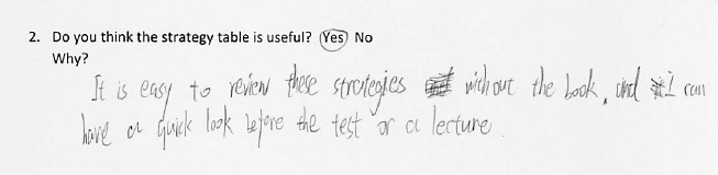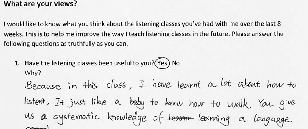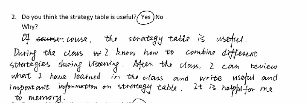 Students finished the course with a record of what they had learnt, a resource to take away, and a more independent approach to their listening skills development. Out of 36 responses, 35 were “yes” and one was “no”, who thought that there were too many strategies to juggle. This student hadn’t yet reached the point of being able to select strategies independently. With 8 weeks of teaching, expecting all students to reach that point may be a little over-ambitious. Many students commented that the strategy tables were useful for reviewing what had been learnt in previous lessons and made remembering the strategies and how to use them easier. I was particularly pleased with comments that cropped up regarding the utility of the strategy table beyond the end of the course. If learners can see how something is going to be useful to them long-term, they are likely to invest more in using it, and be more independent in their use of it.