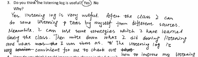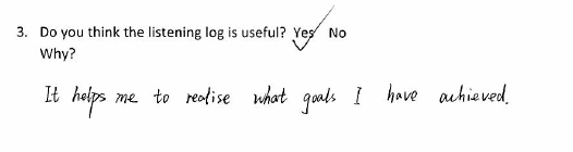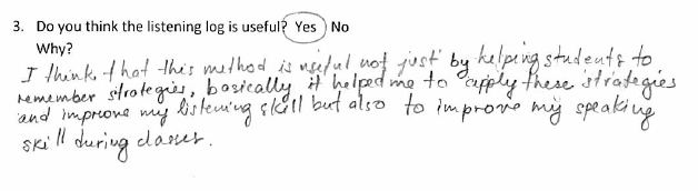 Some students thought the log could be improved by including space for their actual note-taking. Others thought it wasn’t for them. Those that used it, however, did find it useful, as a means of structuring and tracking their out-of-class listening and tracking their progress.