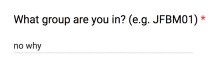 Firstly, we need to decide exactly who our participants will be and why. “You just said term 3/4 September/January students!” I hear you say. Yes…generally, that is the focus. In other words, students who are doing a coursework essay and therefore receiving QuickMark feedback. However, within those two broad groups (September Term 3/January Term 4), we have IFY (foundation) and PMP (Pre-masters) students and the IFY cohorts are streamed by IELTS score into a, b, c and (numbers depending) d groups. So, we need to decide exactly who our participants will be. This choice is affected by things like the age of the participants (some of our students are under 18 which makes the ethical approval process, which is already time-consuming, markedly more difficult) and what exactly we want to be able to find out from our data. For example, if we want to know the effect of the streaming group on the data, then we need to collect the data in such a way that it is marked for streaming group. (NB: as I learnt last term in the context of a plagiarism quiz that had to be disseminated to all students, it is a bad idea for this information to rely on student answers – having a field/question such as “What group are you in?” might seem innocuous but oh my goodness the random strangeness it can throw up is amazing! See pic below…)