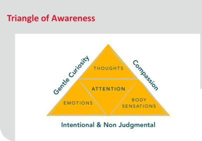 Automatic pilot is not bad. It can be useful. For example, riding a bike we can just get on and ride without thinking about it. We need a certain amount to function in life. However, it is not useful to be stuck/lost in thought all the time, or stuck in the present moment being judgemental of it. (“I don’t want to be here. I don’t want this. This is bad” – resentment, stress.) Mindfulness can help us here. Emma’s definition of Mindfulness is knowing what you are doing whilst you are doing it without judgement. And the without judgement part is important – we may often notice what we are doing but in a resentful/judgemental way, ruminating. Mindfulness allows us to notice what is happening and step away in a non-judgemental, kind way. It is a way to step of the the cycle and start to do something proactive to calm down and get the thinking lid (prefrontal cortex) back down, so that you can deal with the situation creatively and with wisdom.
