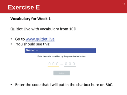Ask students to review how the week has gone, what work they have done, have they understood everything etc. (I found the most time efficient way of doing this was having the review questions on a slide and asking each student to answer all the questions on the slide (up to 3) in one go. Rather than by one question at a time or by using the chatbox. To save the faff of mics going on and off and typing speed, which I also trialled and errored, so to speak!)