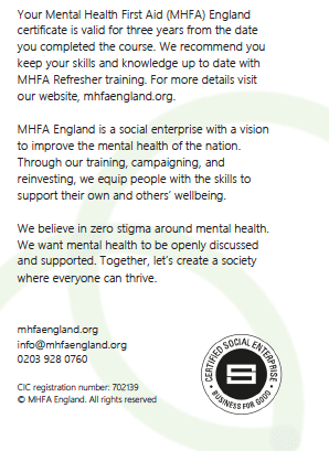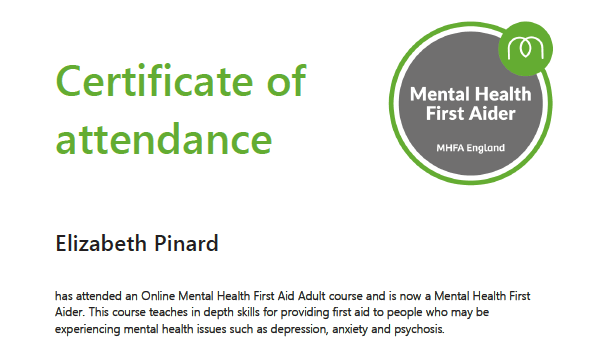 I am now a qualified Mental Health First-aider! I completed a two day course run by MFHA England on 17th and 18th of February (been playing catch-up ever since because of losing those two days of work!!) in order to be a Mental Health First Aider for my team at work, along with a colleague of mine who did it the same week but a different two days.