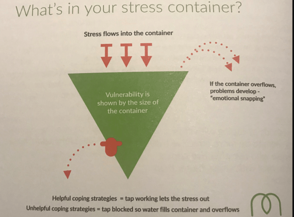 To finish off, here is an MFHA link from a 2018 campaign which focuses on stress and contains a little slide show about the stress container and some awareness raising activities. I hope it, and this post, will be of some use for you. I would recommend to anybody thinking about it to do a Mental Health first aid course both for personal gain and for better ability to help others.