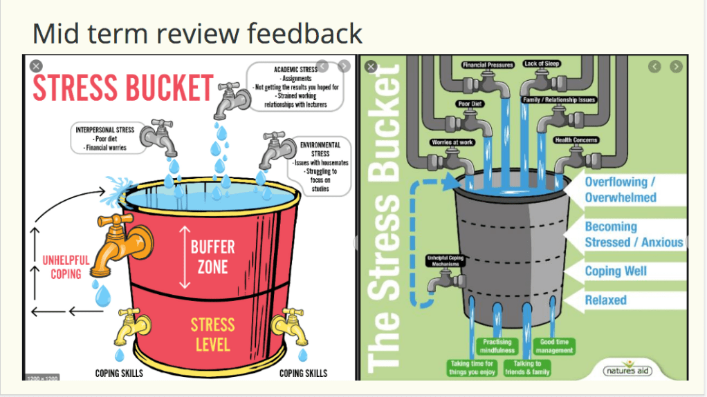 To me, none of the above is particularly new in and of itself but the stress container metaphor helps give it all coherence and, importantly, while the locus of control for some of it is outside our control (stress container size, stressors), it does show that we do have some control which it is important to exercise for our wellbeing, in terms of which coping strategies we use and when/how often we use them. I have already used the stress container/stress bucket metaphor with my students since learning about it. I did a mid-term feedback form and one of the questions asked them how they are feeling at the moment and stressed/under pressure/tired were common themes. Which is normal on an intense course like the one they are following with us (multiple modules, not only Academic English, and a heavy assessment load all round). In a subsequent lesson, as part of responding to the feedback I introduced the stress container/bucket, using images found online, reassuring them it was normal to feel stressed (it doesn’t mean they aren’t good enough to do the course or that they are a failure or anything like that – which is not a common assumption to make when you are in the midst of doing something that generates stress!) and that the important thing is to deal with it appropriately so that you don’t reach the point of overwhelm, and got them to share their favourite positive coping strategies in the chat box.
