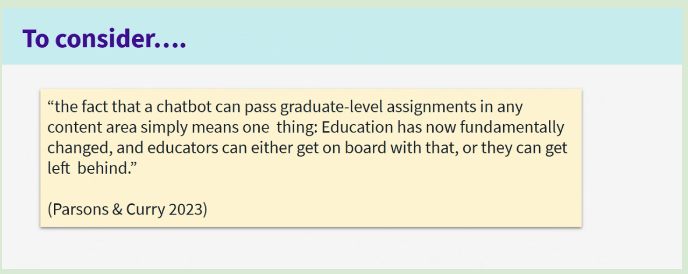 A session about Generative AI and EAP that I attended recently provided the above quote for our consideration. I think one of the things that is challenging about the Generative AI landscape and its presence in the context of higher education is that it evolves so rapidly. This rapid evolution contrasts starkly with much slower-moving policy-making and curriculum development processes. Certainly in my current context, this issue of becoming “left behind” has been one that we have been grappling with for a few years now. Initially, there was a period where once generative AI had emerged into existence, all we could do was watch, as it became increasingly apparent that students were using it in their assessments, while awaiting a university policy to inform our response. An extra layer of waiting then ensued because as well as being university policy-informed, we are Studygroup policy-informed. During that wait, our response to generative AI had to be “No. You can’t use this tool. It is against the rules. It will result in academic misconduct.” Of course, being as assessment in pathway colleges is high stakes (the deciding factor in whether or not a student can access their chosen university course), students use it anyway, due to running out of time, due to desperation, due to self-perceived inadequacy.