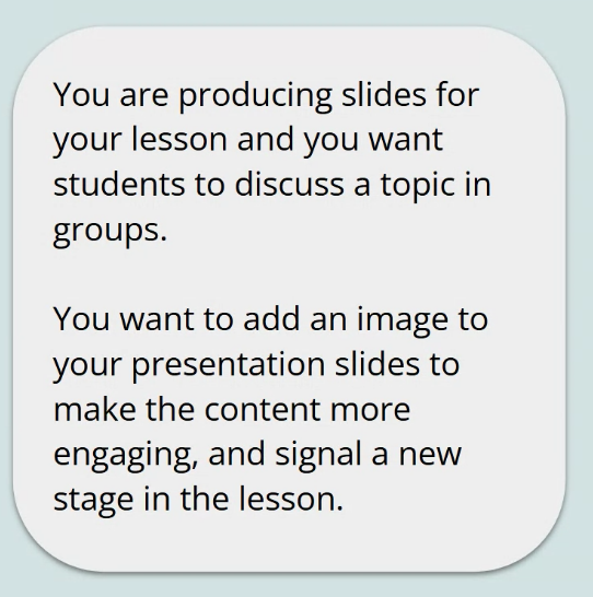 So al very cool but actually stock images like Pixabay (and creative commons licensed like Flickr – in particular ELTpics – if the context is suitable), i.e. human generated, are much less resource-intensive to use. So, don’t get too carried away by the “it’s so cool” thing. I tend to use Google image search and the appropriate level of license filter, personally.