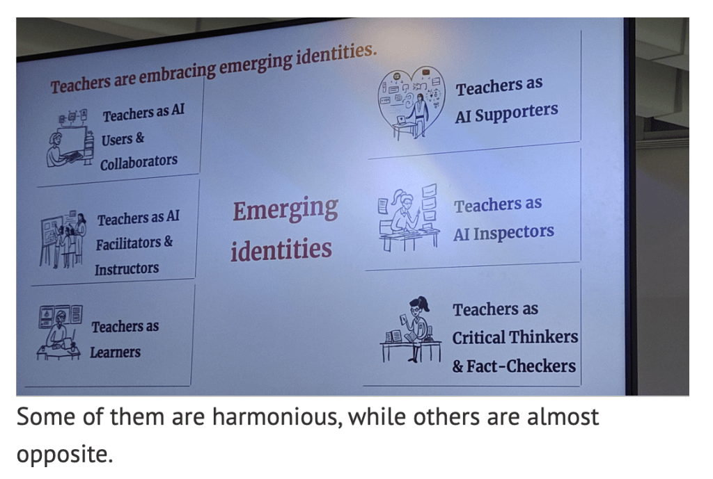 There’s a lot to think about there! I suppose I have mainly been teacher/coordinator as AI inspector in professional terms, but also teacher as learner as despite my personal misgivings: I have made an effort to attend (whether live or via recording) all the training available to us regarding AI. I have been teacher as AI user when I have used it to generate discussion questions (and then teacher as critical thinker when I have deleted half of them as unsuitable and edited/adapted others!). Teacher as AI instructor/facilitator, of course, as mentioned above, is still in the “coming soon to a classroom near you” stage. I suppose will have to be “teacher as AI supporter” within the “teacher as instructor/facilitator” side of things – regarding what we decide are acceptable uses of AI…but I predict it will be more along the lines of channeling inevitable use rather than encouraging use vs non-use! And I think alongside that, I will definitely be encouraging critical discussion in my classroom regarding the use of AI and surrounding issues. It will be interesting to see what the students think. It seems to me that just as much as the youngsters in the Vietnamese study, us old fossils who have been teaching a good while also need to regularly engage with our professional identities and figure out how we are going to move with the times professionally, regardless of (although obviously also interlinked/connected with/influenced by!) our personal feelings towards the various changes (which as Catherine Walters’ plenary discussed, have been many and varied over the last 50 years!)