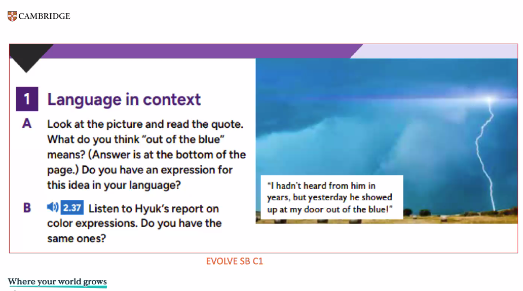This is focusing on a humanist idea of education in terms of the role of teacher and learner. In Evolve (coursebook), they have students from different countries who are the same level as the coursebook user. When the student does an activity, they watch a video of someone like them doing it. See example below: