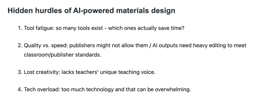 Both of these screenshots set voice against AI-generated content. The first one (which looks like an interesting webinar – Wednesday 14th May between 1600 and 1700 London time in case you might like to attend!) seems to be about helping learners develop their own voice in another language and suggests that this aspect of language learning is of greater importance in a world full of AI output. The second is in the context of materials writing, and highlights an issue that arises in the use of AI in creating materials – “lacks teachers’ unique voice”. The speaker goes on to offer a framework for using AI to help with materials writing while avoiding the problems listed in the above screenshot. (See Sandy Millin’s write up for further information! The post actually collects all of her write-ups of the MaW SIG 2025 PCE talks in a single post – good value! 🙂 )