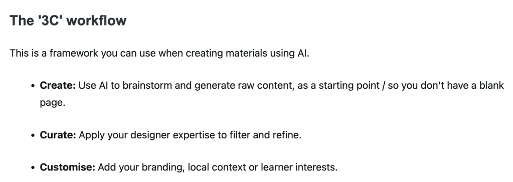 Of course we can’t just implement this, we need to go through the process of getting approval from Studygroup for it and then building it into our materials. We can’t just expect learners to meet our expectations with no guidance other than the above list embedded in an assignment brief. Much like was discussed in the AI and Independent Learning webinar, we need to help the students to develop the skills that they need in order to use AI appropriately and effectively. This will include things as basic as how to access the university-approved AI (Gemini) and how to use it (including how to write prompts that get it to do things that are helpful and appropriate and equally avoid accidentally getting it to do things that aren’t helpful or acceptable). Also important will be raising their awareness of ethical issues surrounding the use of AI and of its inbuilt bias, as its output depends on what it has been trained on and there is always the risk of “hallucination” or false output. They will need to be cognisant of its strengths and weaknesses, and to develop an ability to evaluate its output so that they don’t blindly use or base actions on output which is flawed. Their ability to evaluate will also need to extend to being able to assess when and when not to use it, and how to proceed with its output.