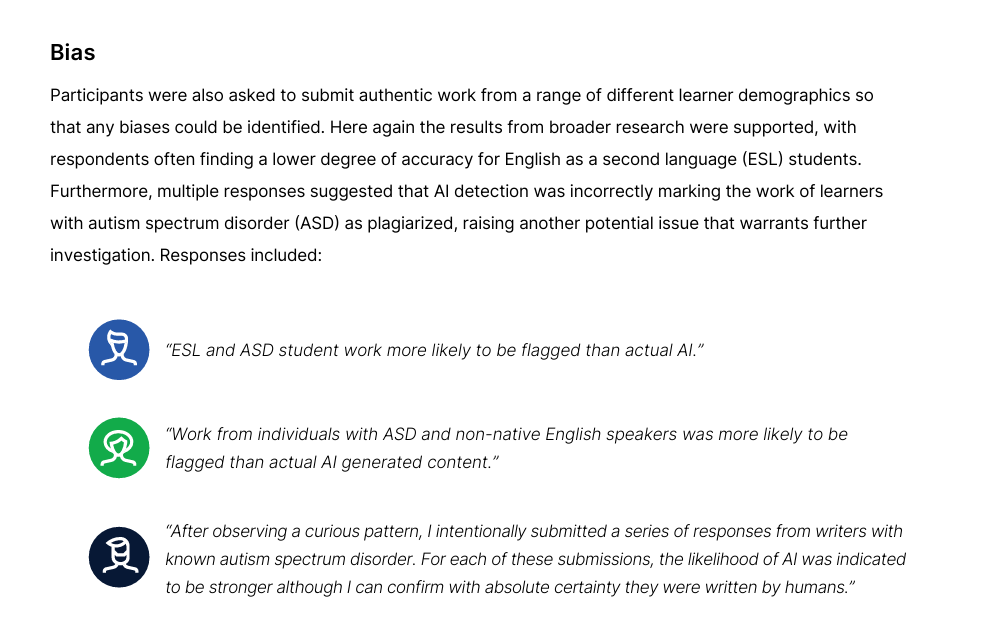 If ESL and autistic voices are more likely to be flagged as AI generated content, then our AI detection tools do not allow space for these authentic voices. These findings point to a need to be very careful in the assumptions we make. I’m sure we’ve all looked at a piece of work and gone “this was definitely written by AI, it’s so obvious!” at some point. Hopefully our conclusions are based on our knowledge of our students, and their linguistic abilities, previous work produced under various conditions and so on. However, for submissions that are anonymised this is no longer possible. I think, rather than relying on detection tools, we need to work towards making our assessments and the criteria by which we assess robust enough to negate the need for such tools. Either way, the findings would also suggest that the webinar described in screenshot no. 1 may be very pertinent for teachers in our field. (I wonder if the speakers have come across instances of that line of research too?! I increasingly get the impression that schedule-willing, I may be attending that webinar!)
