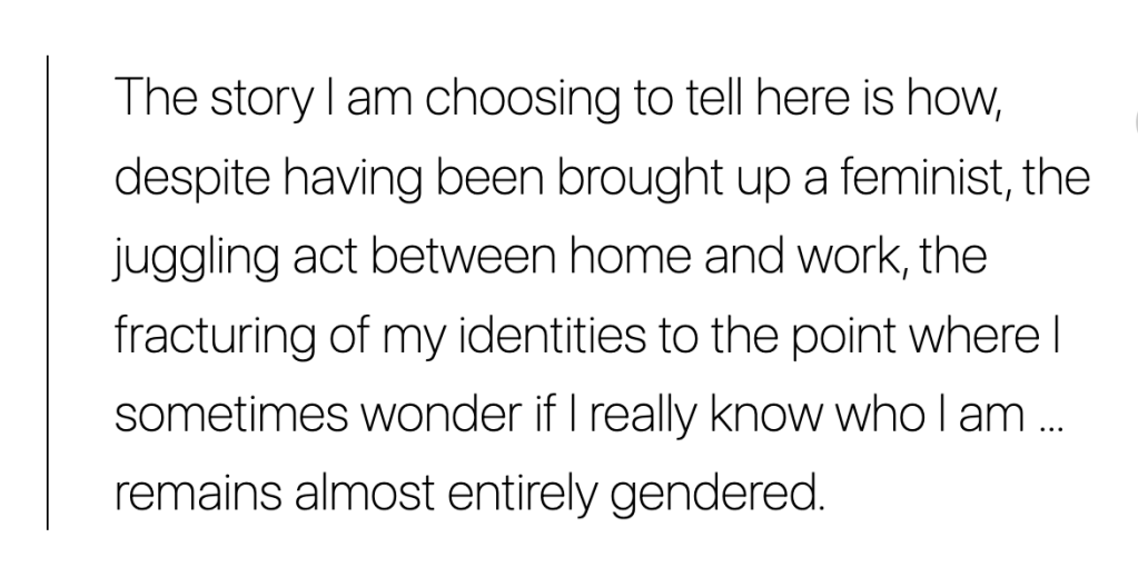 So, those two, between them, account for nearly 100hrs out of the 129. It’s inevitable that a course is going to represent a larger number of hours than one-off things can. A distant third, in terms of chunks of hours, is the ELTC Away Day which accounted for 6hrs: A morning of talks and an afternoon of workshops, all F2F. For me the highlight of the day was the session in the afternoon about the EdDoc run by Sheffield University’s School of Education. In an ideal world I’d like to start doing one in the academic year 2026-2027. Since that session, which took place in late September, I’ve come up with an idea and started doing some reading around it – though the Instructional Design course temporarily moved further reading/preparation to the back burner (time is finite, however hard I hyperfocus!). Close behind the Away Day, in terms of hours, was a “slow conference” called Feminism X EAP, which I spent 4hrs on, not consecutively but over the course of a week or so. It seems a long time ago now, but it took place between the 9th and 15th May. It was really interesting, Story – by Bea Bond. It was Activity 2/3 on Thursday 9th May::