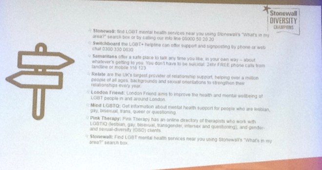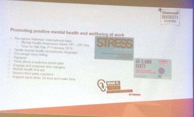 We were finally given some suggestions for promoting better mental health in the workplace and some resources relating to LGBT+ and to mental health: