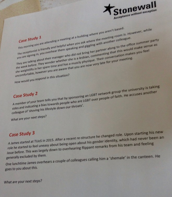 I think the topic and content of this workshop also has relevance to the classroom and to us as teachers as well as as workers. Statistically, there will be LGBT+ students in our classrooms. We need to actively make our classrooms an inclusive, safe place for them. This means that if students say things that are LGBT+phobic, we, as teachers, shouldn’t be a quiet Switzerland on the issue. We should be calling it out. Obviously this gets a lot more complicated if you are working in a context which is not tolerant of LGBT+ people and/or in an institution whose policy on this is undefined. I think ELT school managers should, where possible, have clear policy around LGBT+ bullying being unacceptable and teachers should be aware of this and know that they would be supported in calling students out on it. (A teacher can’t tackle such a problem without the support of the school – if the student complains, the school needs to be supporting the teacher.) This, of course, is affected by the students as customers perception that is common throughout ELT. Training around how to deal with LGBT+ issues in the classroom may also be useful. E.g. what would you do if in a unit talking about personal relationships, a female student refers to her partner as “she”? Is it a pronoun mistake or an assertion of identity? How do you establish which it is? How do you deal with other students’ response?